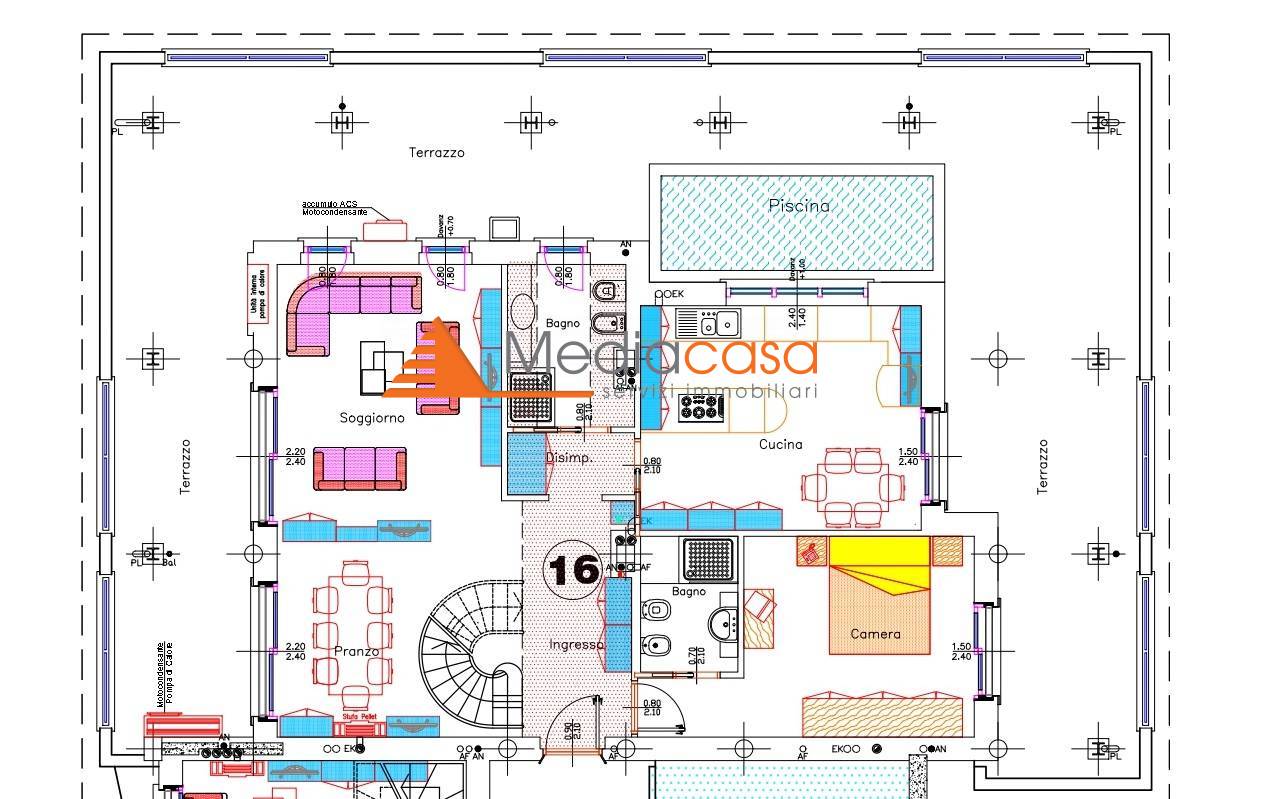 L'immobile è disposto su 2 livelli ed è composto da ampio ingresso, soggiorno, zona pranzo, ampia cucina abitabile, bagno, camera ospiti con bagno e terrazzo di mq 100 con piscina; 3 ampie camere da letto al piano mansardato