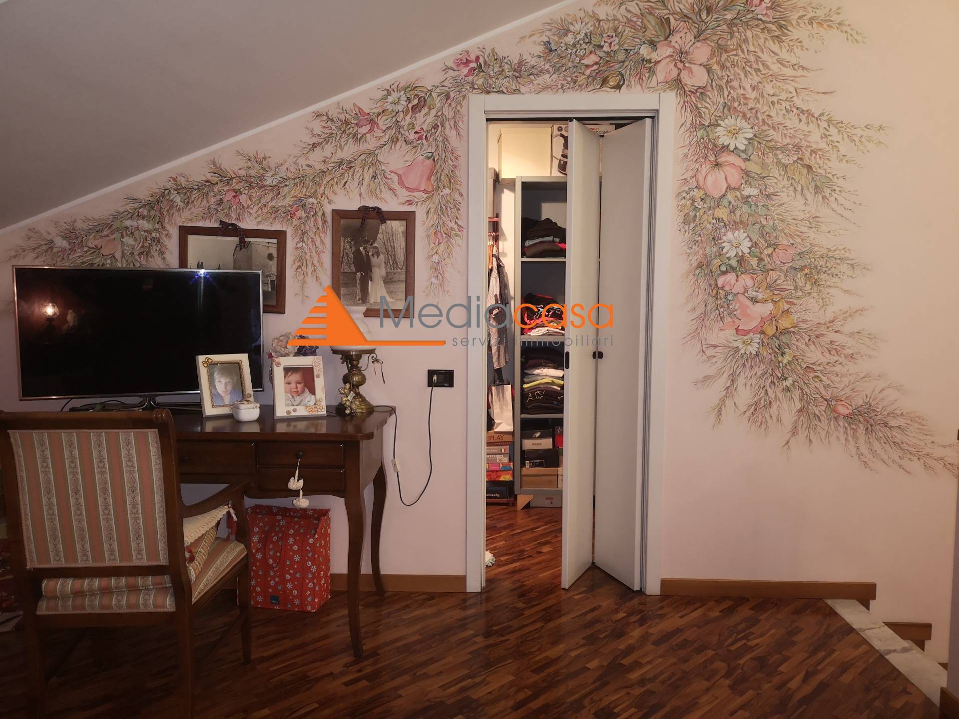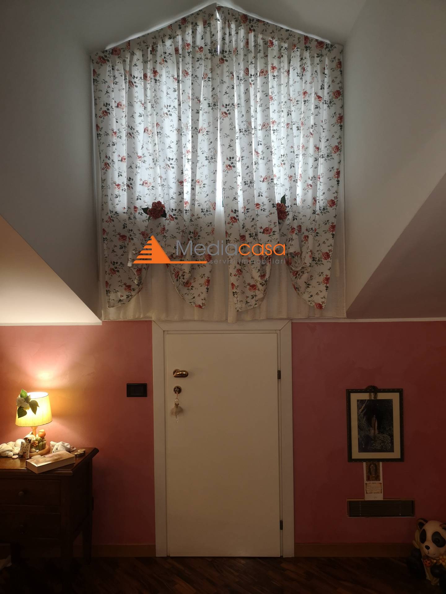 al piano secondo mansardato con accesso da comoda scala interna ampio open space adibito a camera con cabina armadio, zona palestra, ripostiglio, bagno/lavanderia con doccia e balcone.