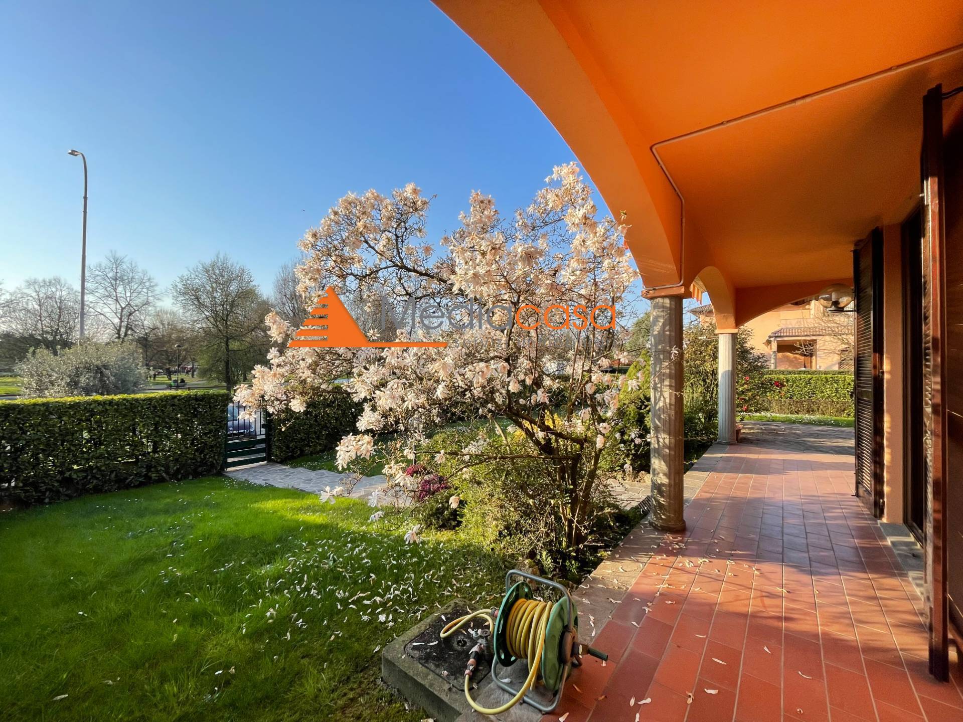 Completa la proprietà un bellissimo giardino piantumato dotato di impianto di irrigazione autiomatico, un ampio e riservato patio oltre ad un porticato che percorre il perimetro della costruzione.